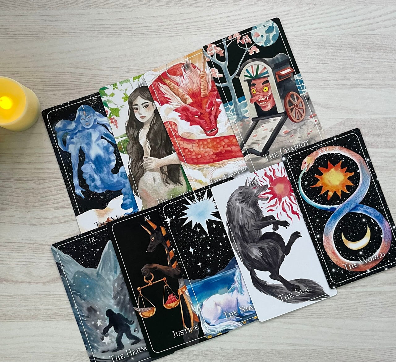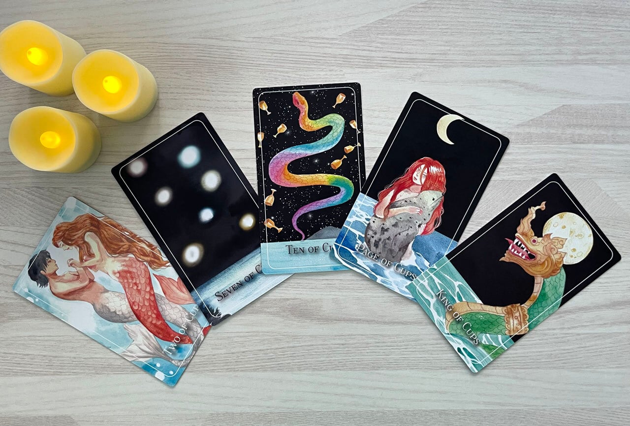 伝説の生き物たちの神秘的な世界と水彩画の繊細な美しさが融合した、他に類を見ないタロットデッキです。