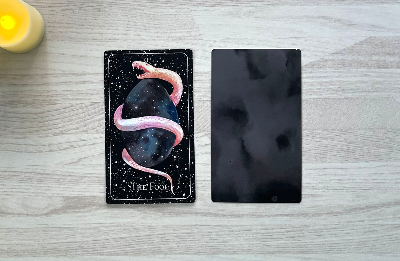 「ソウルクリーチャーズ・タロット」デッキでは、愚者のカードはオルペウスの卵(または宇宙の卵)で表されます。それは、宇宙の創造が始まる前から、宇宙そのものへと孵化した卵です。